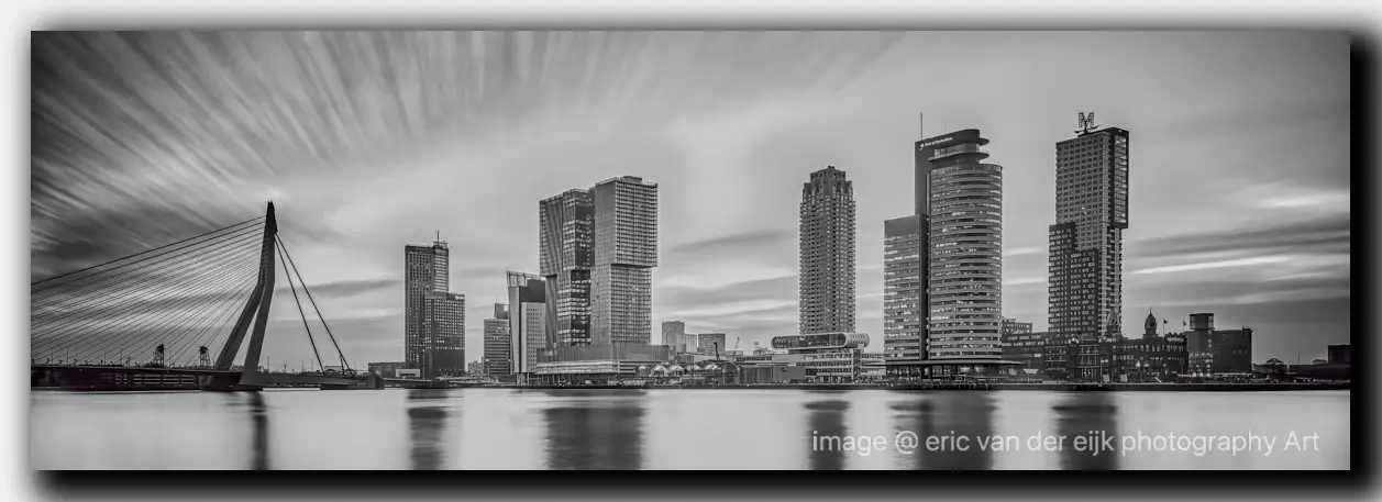 Zwart-wit foto van de skyline van Rotterdam met moderne architectuur en krachtige contrasten. Tijdloze stadsfotografie met een minimalistische uitstraling. [beeldnummer_cityscape_00127]