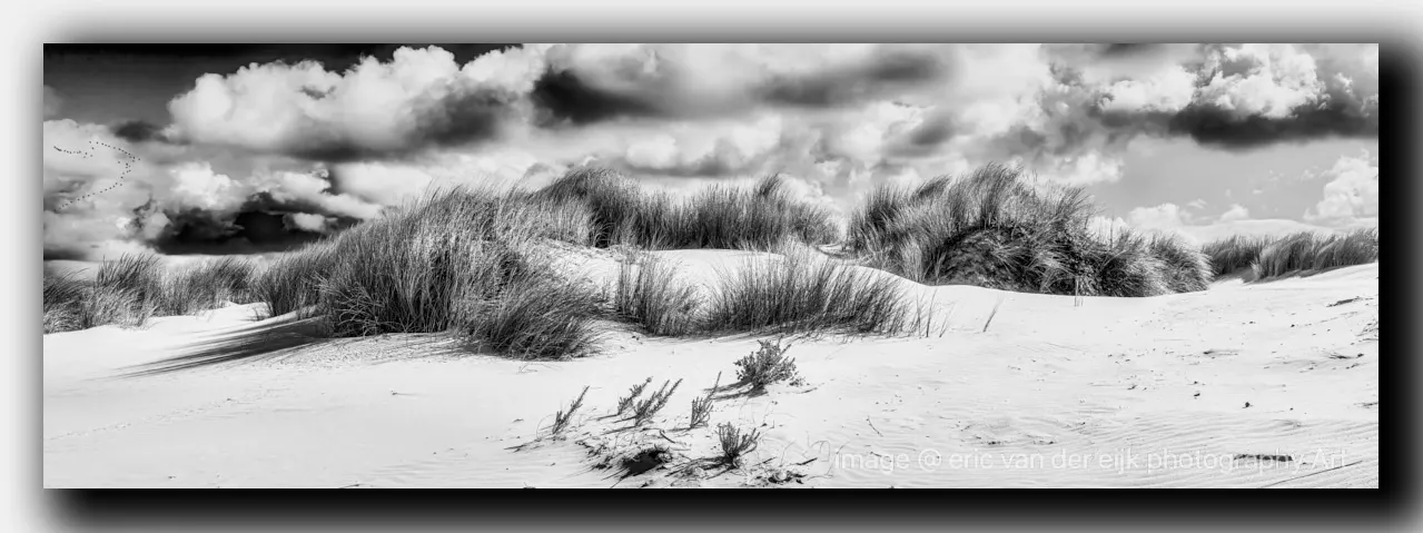 Zwart-wit panorama van duinen met serene lijnen, licht en open ruimte. Minimalistische fine art fotografie vol rust en tijdloze schoonheid. [beeldnummer_duinen_02019]