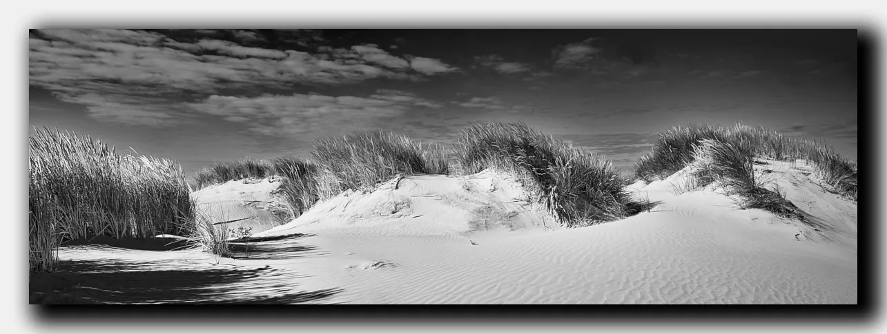 Zwart-wit panorama van duinen met nadruk op licht en open ruimte